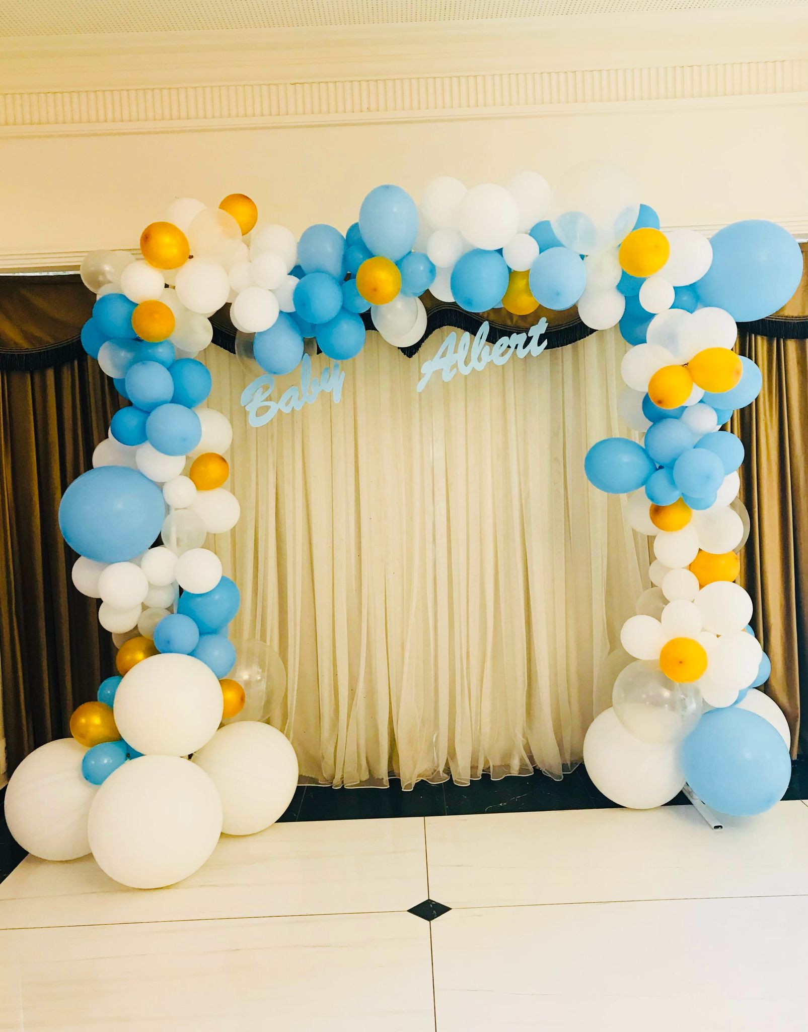 Celebrate life’s sweetest moments with this charming balloon arch, specially created for Baby Albert’s big day! Featuring a soft palette of baby blue, pure white, and touches of shiny gold, this design brings warmth, joy, and a festive sparkle to any celebration.