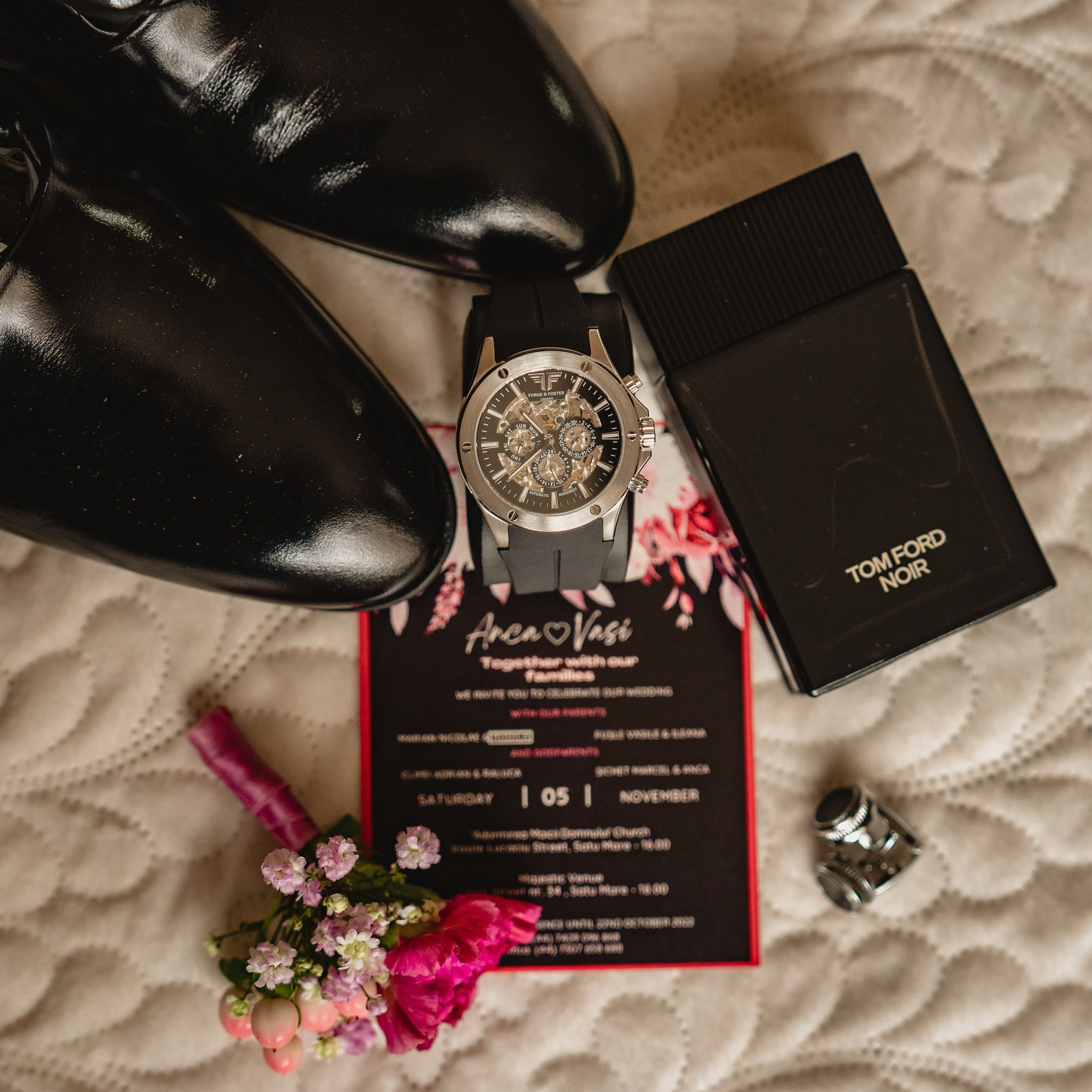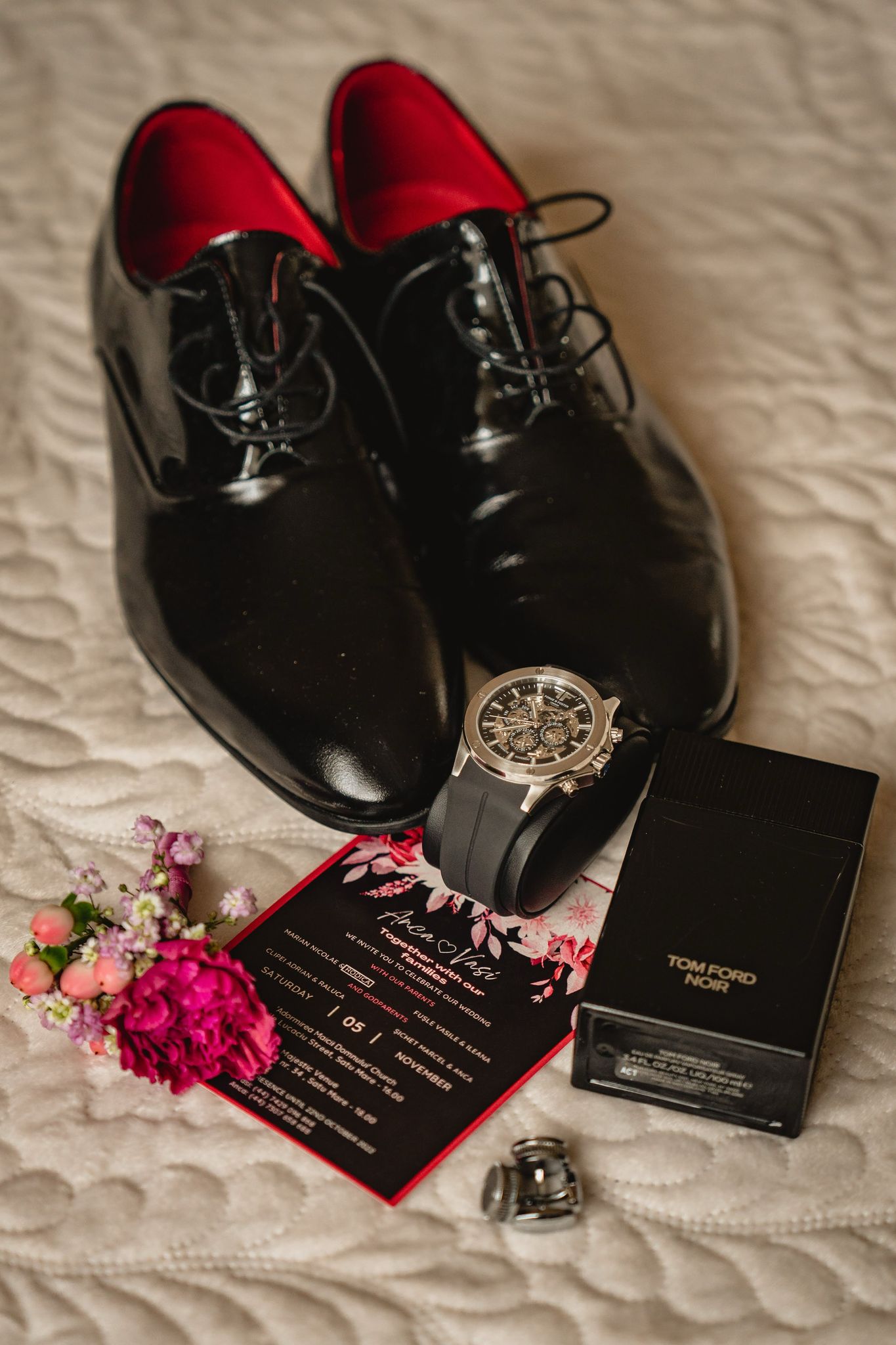 Whether paired with the bride’s sparkling accessories and delicate perfume, or the groom’s polished essentials and signature scent, our invitations become part of your full wedding aesthetic — not just paper, but a piece of the emotion you share.